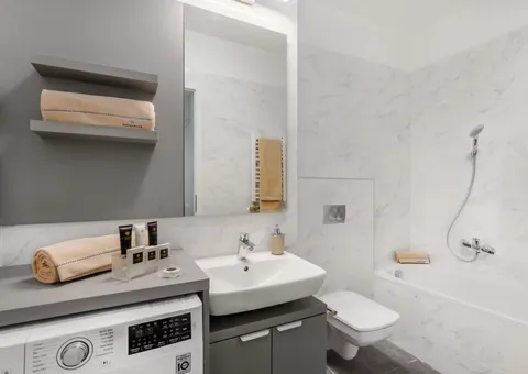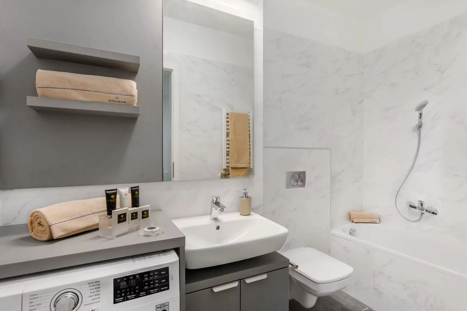 Our bathrooms are also fully equipped for your convenience. Our colleagues provide small and large towels, shampoo, and shower gel per person in the apartment. If you need additional towels, hair conditioner, or shower gel, please contact the reception! Our service is available free of charge 24 hours a day.