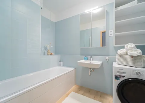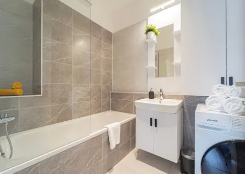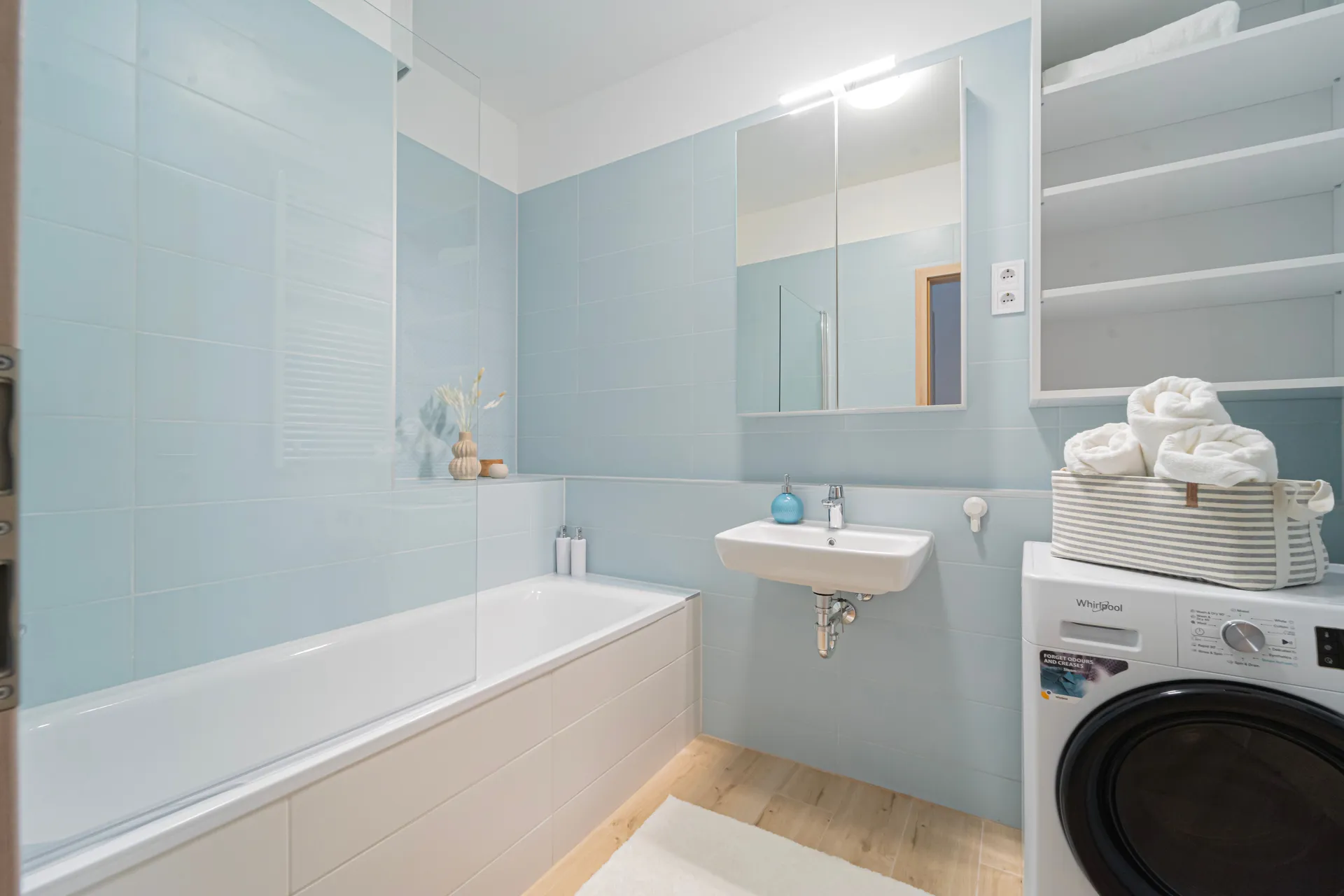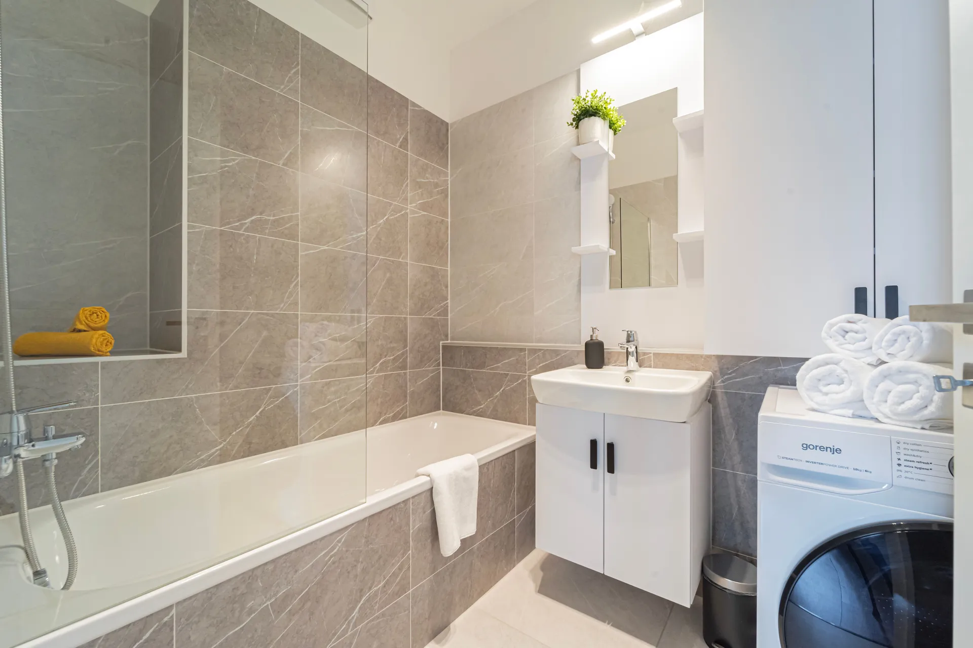 Our bathrooms are also fully equipped for your convenience. Our colleagues provide small and large towels, shampoo, and shower gel per person in the apartment. If you need additional towels, hair conditioner, or shower gel, please contact the reception! Our service is available free of charge 24 hours a day.
